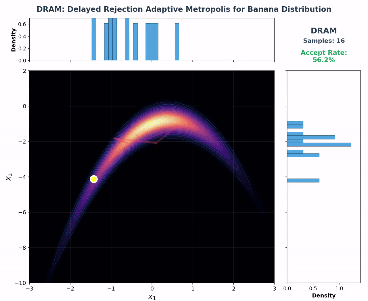 Delayed Rejection Adaptive Metropolis sampling a nonlinear banana-shaped target.