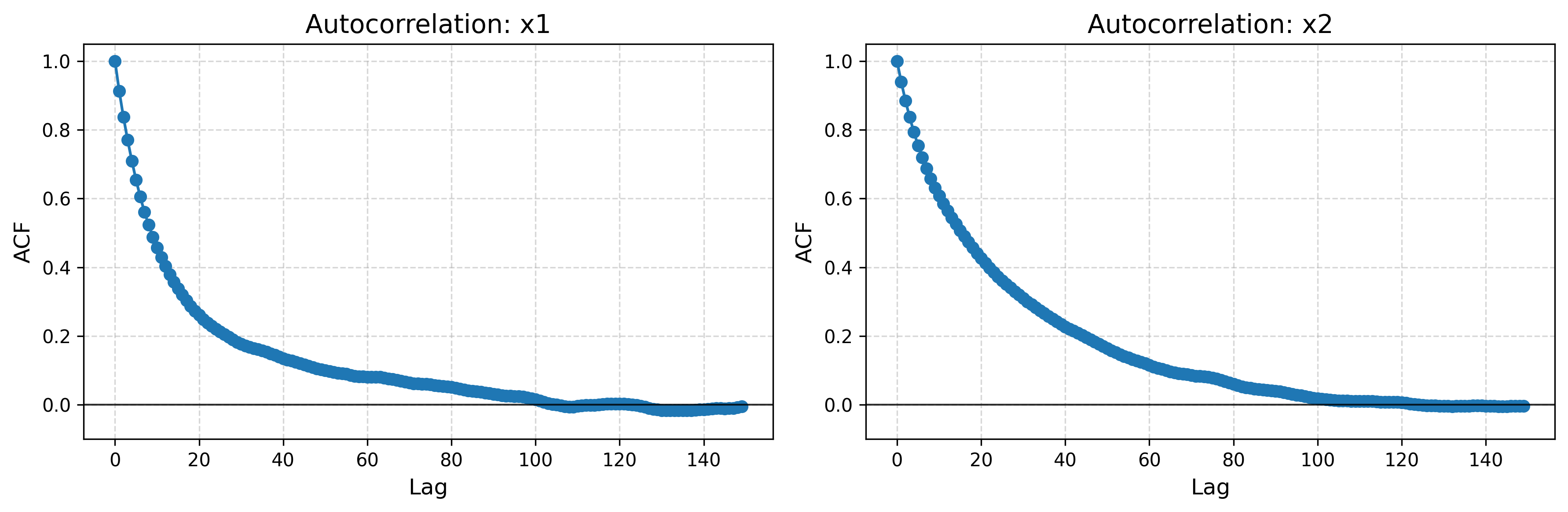 All diagnostics: burn-in, mixing, autocorrelation, integrated autocorrelation, and ESS, are derived in the MH diagnostics notebook and reused across the remaining algorithms.