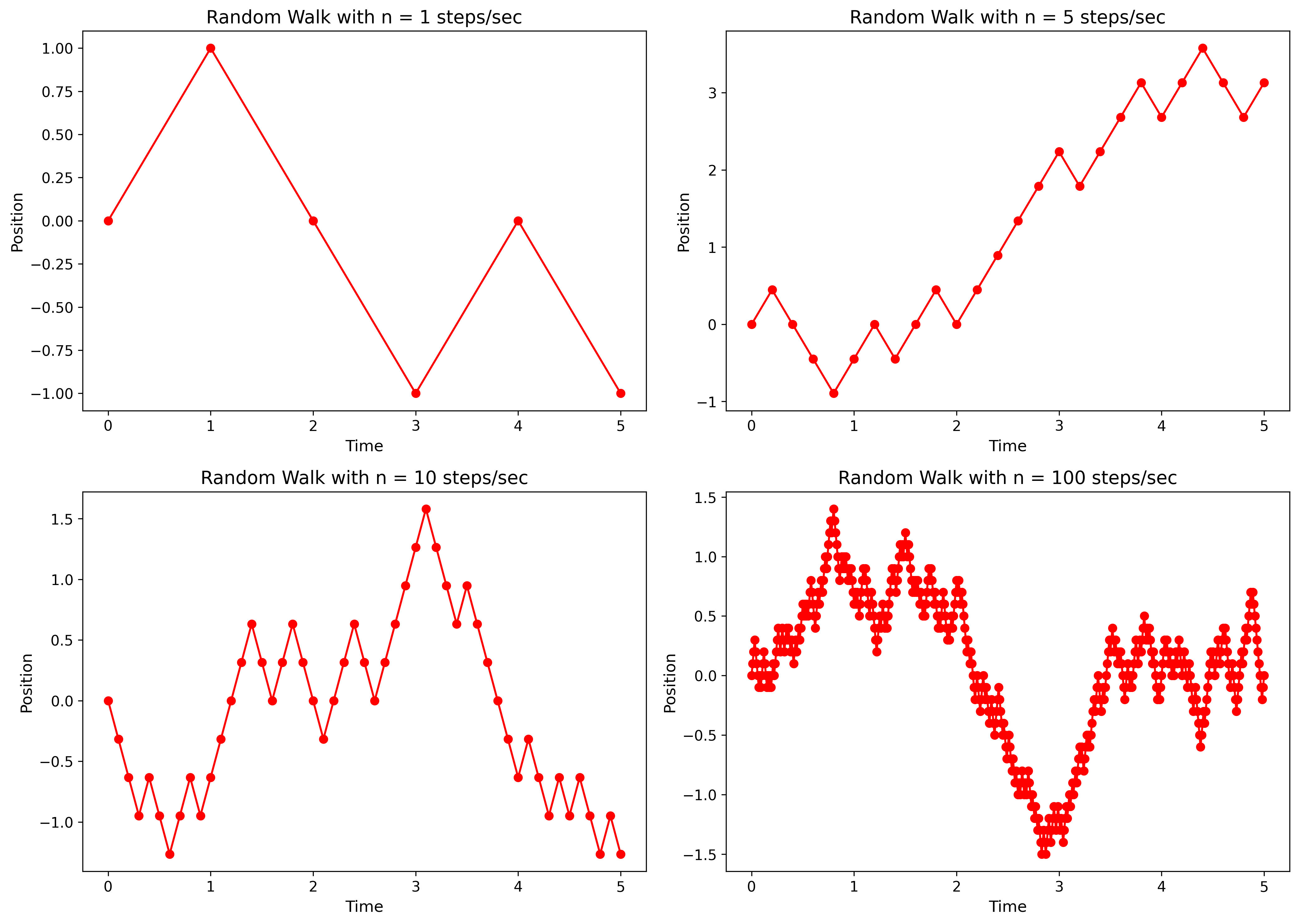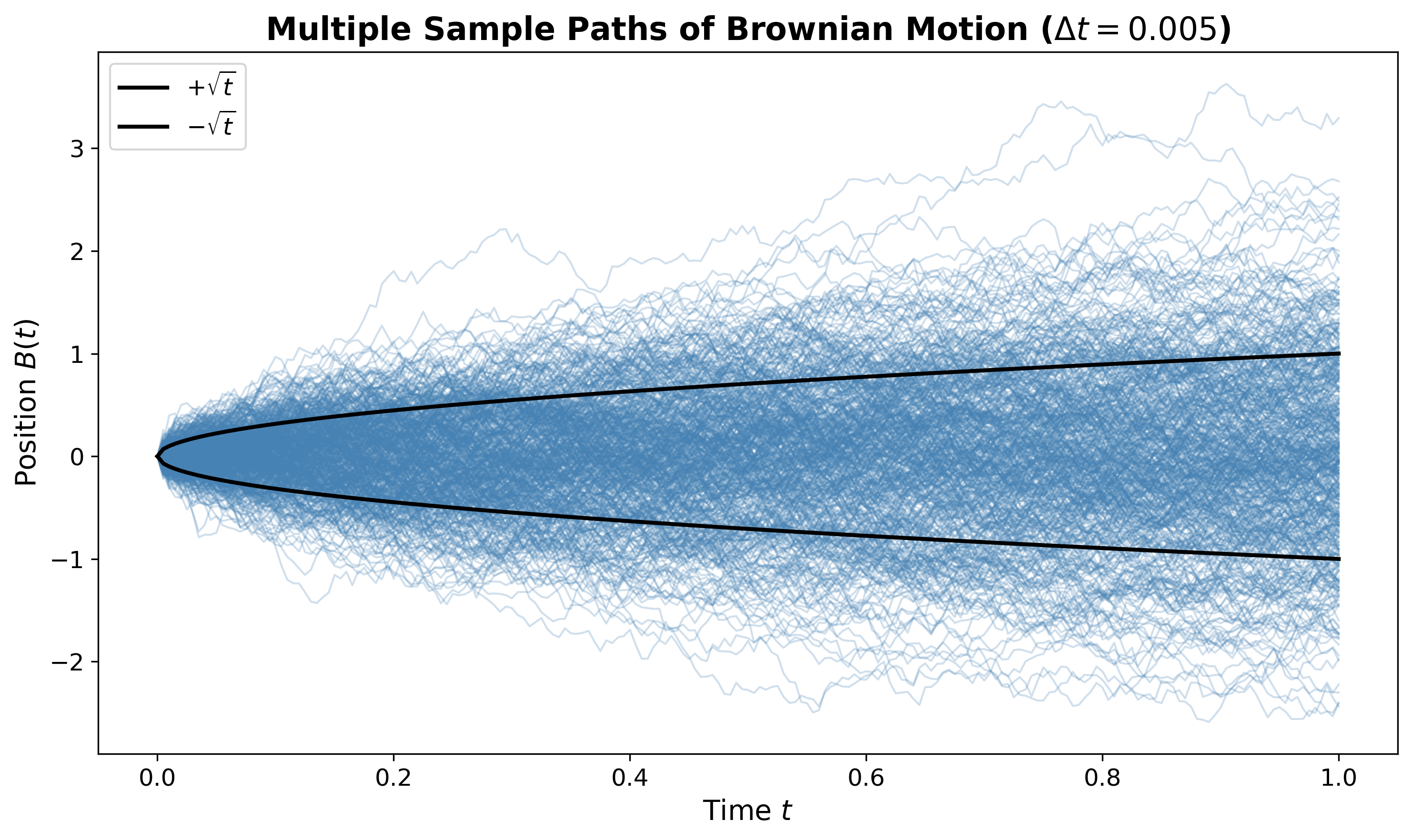 Random-walk scaling to Brownian motion and simulated sample paths.