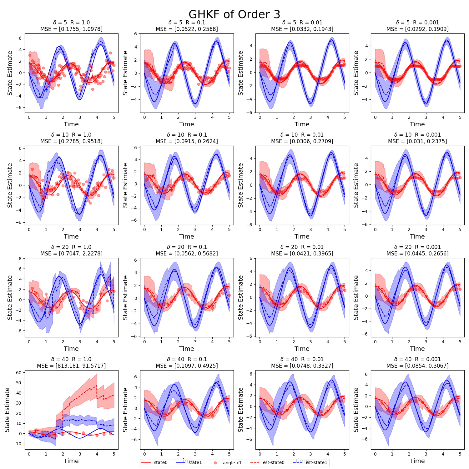 This benchmark compares Extended and Unscented Kalman filters, Gauss-Hermite filters, and Particle Filters on a nonlinear pendulum. Estimation accuracy, computational cost and robustness to non-Gaussian noise were evaluated across varying sensor noise and update rates.